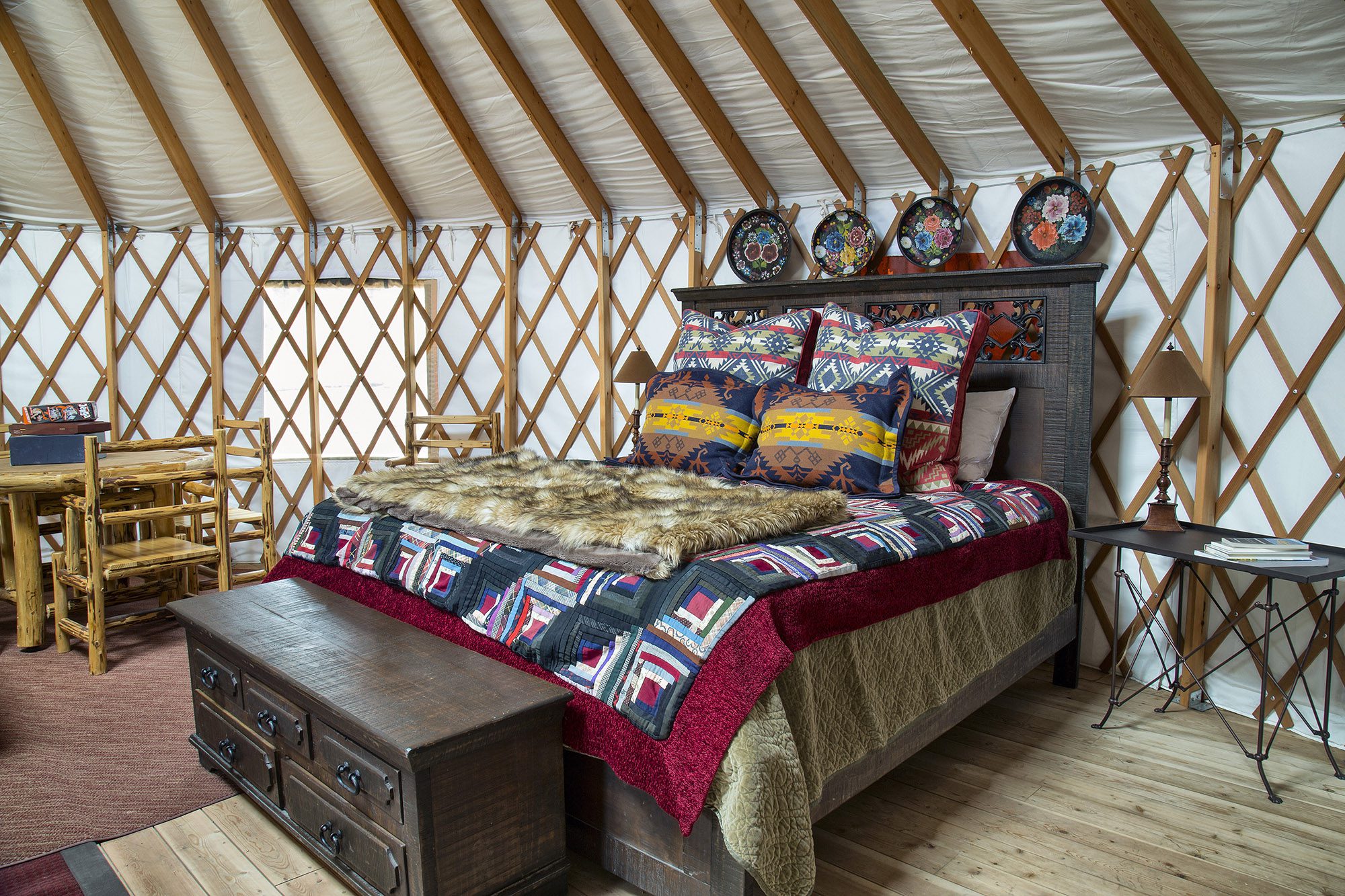 Enjoy the beauty of nature without sacrificing comfort. Our Wyoming glamping resort features one luxury yurt and two glamping tents complete with plush beds, cozy western furnishings, and modern amenities of electricity and bathhouses with running water. Each accommodation boasts plush western furnishings and panoramic views that will leave you breathless.