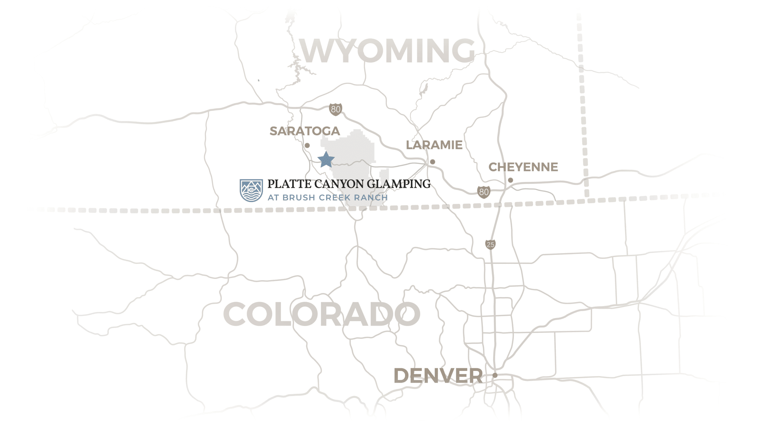 Part of the Brush Creek Luxury Ranch Collection, Platte Canyon is your all-inclusive glamping resort in south-central Wyoming. Private and remove, this waterfront property is 25 minutes into the peaceful wilderness from the gates of the Lodge & Spa. Private air into Saratoga Jet Center will land you closest to our historic ranch, or scenic views can be enjoyed along the I-80 and WY Hwy 130 driving approximately one hour from the Laramie Regional Airport or three and a half hours from Denver International Airport.